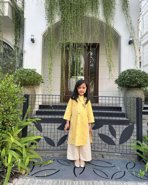 Áo dài bé gái Linen Áo vàng thêu hoa đào