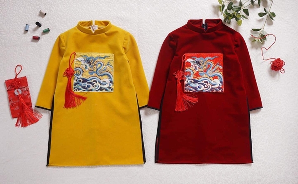 Áo dài long nhung bé trai hai màu: vàng, đỏ mận