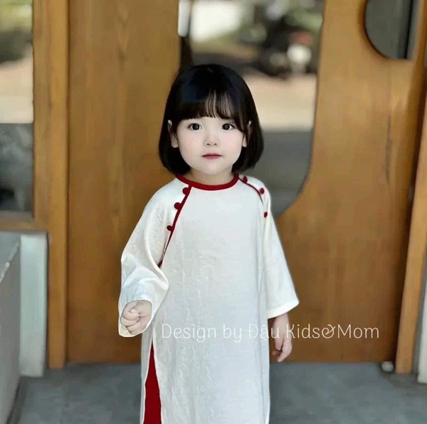 Áo dài lụa Gấm trắng cho bé, chất liệu lụa tơ tằm xịn đét, hàng cúc bọc cẩn thận tạo điểm nhấn, 1 set gồm 3 chi tiết: áo + quần + khăn đỏ
