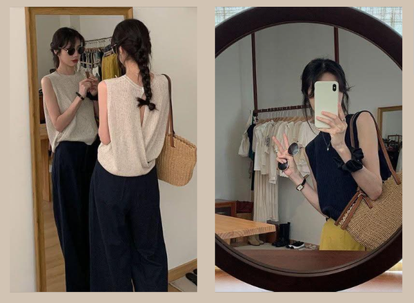 Áo len dệt kim sát nách xoắn lưng 2 màu kem và đen