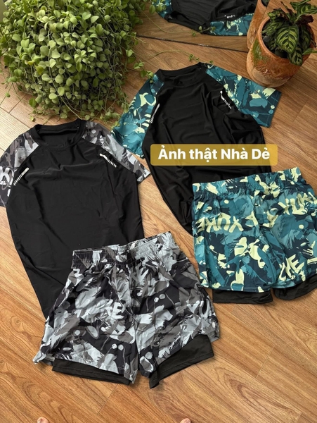 Bộ bơi nam Ylike áo cộc tay quần 2 lớp màu đen phối xanh lá và xám