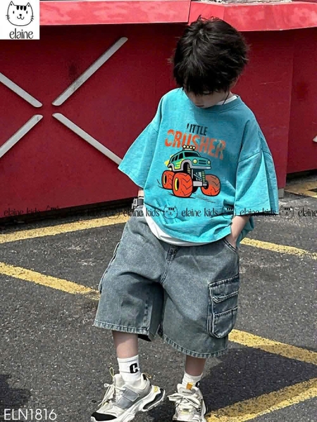 Bộ bé trai cộc tay áo xanh oto Little Crusher ELAINE quần sooc jean