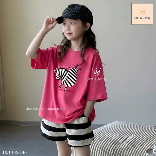 Bộ cộc tay Jam&Jenny Ngựa vằn áo hồng sen quần sooc kẻ bé gái