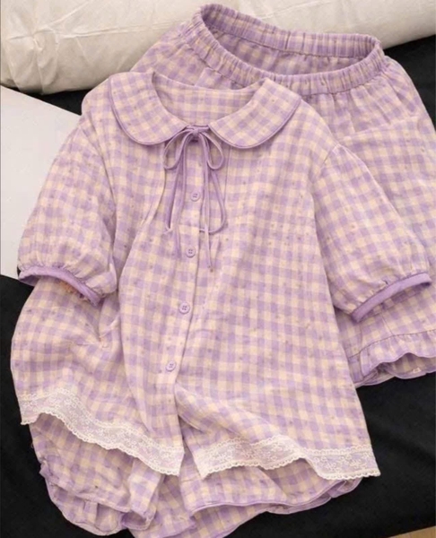 Bộ ngủ cộc tay tím caro cổ sen mix hoa nhí