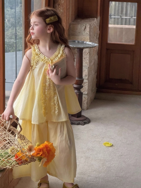 Bộ sát nách voan tơ phối bèo màu vàng quần suông bé gái