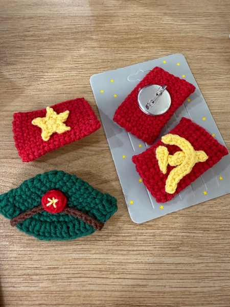Cài áo móc len hình cờ đỏ sao vàng, mũ cối, cờ đảng