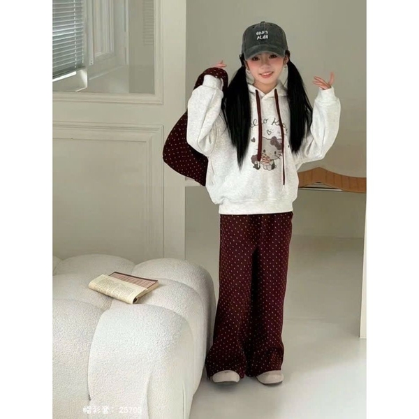 Set 3 món Hello Kitty áo nỉ ghi, quần chấm bi nơ đỏ và túi