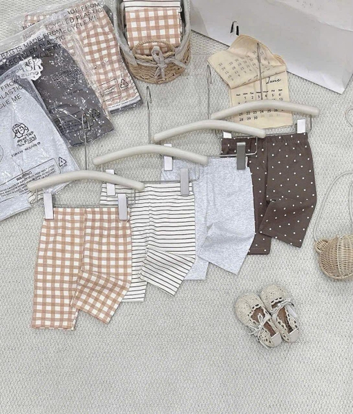 Set 4 quần legging lửng bé gái caro cam, chấm bi nâu, kẻ ngang, ghi