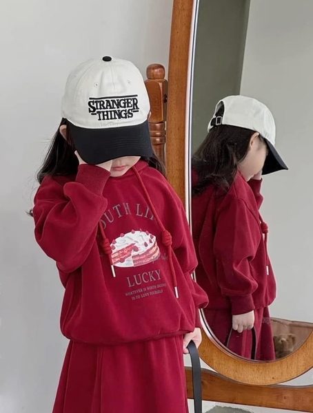 Set áo nỉ bông hoodie mix chân váy đỏ dáng dài Hi.Sun