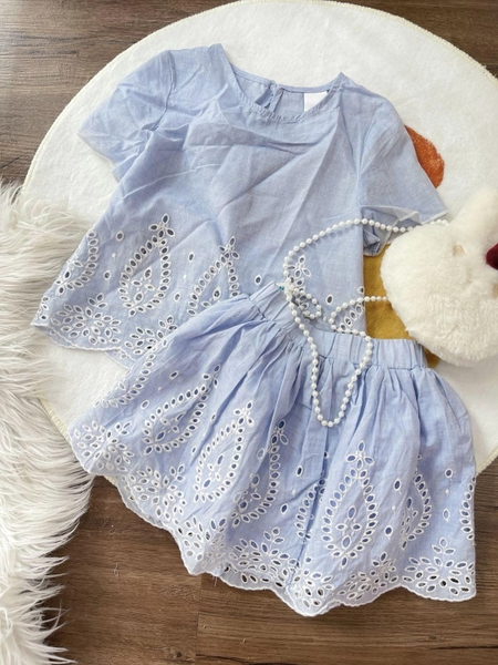 Set bộ cộc tay ren thô chân váy màu xanh xuất Anh