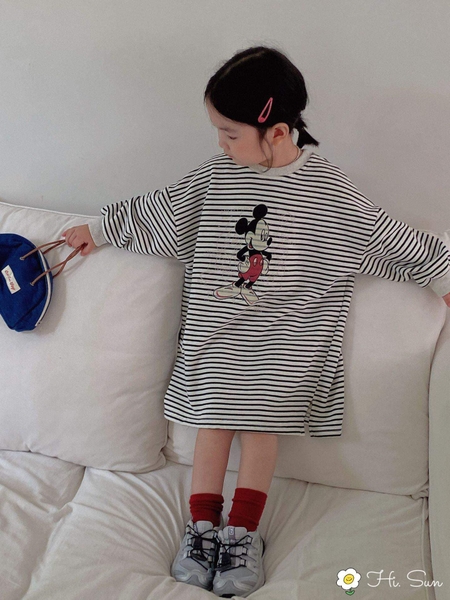 Váy dài tay Hi.Sun dáng suông cotton da cá Mickey kẻ ngang
