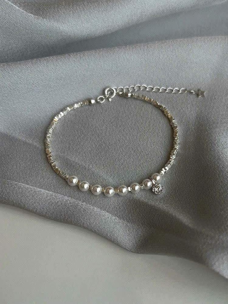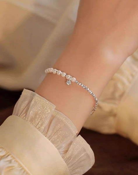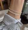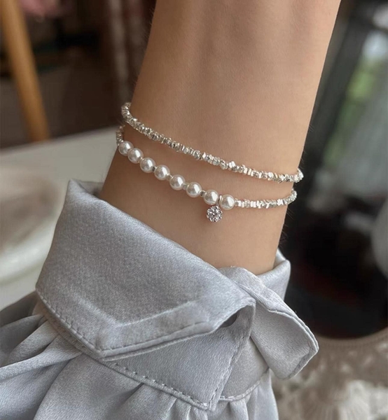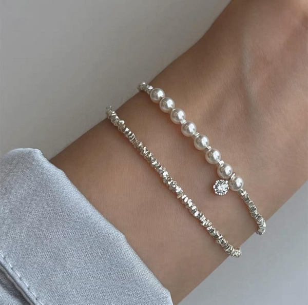 Set 2 vòng tay layer 3in1 màu bạc mix ngọc trai